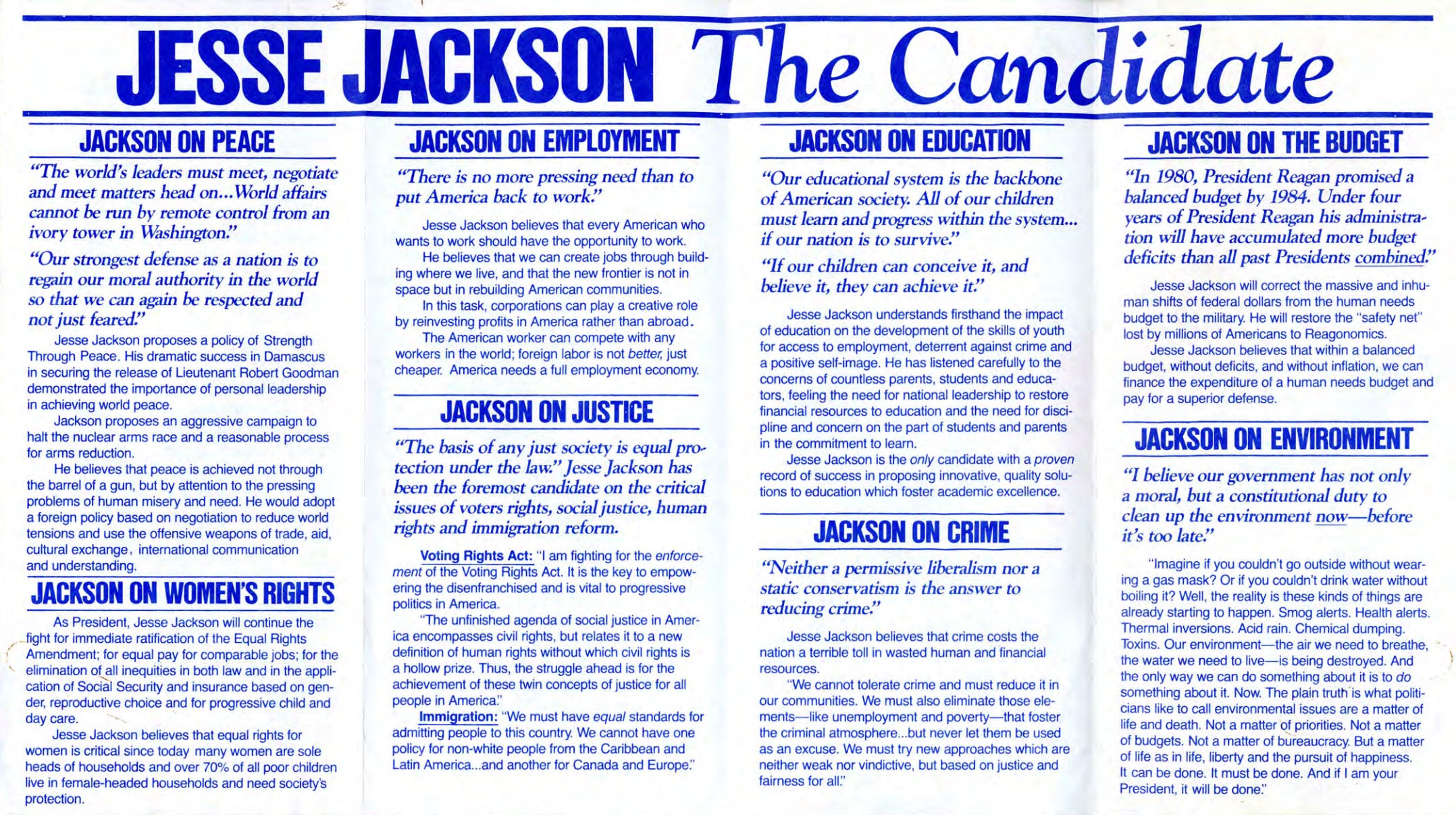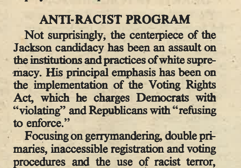 “The Jackson campaign has already expanded the agenda of the 1984 presidential race,” wrote Frances M. Beal. “But it’s long-term impact on the Democratic Party, Black community politics, and the working class movement may be more important.”