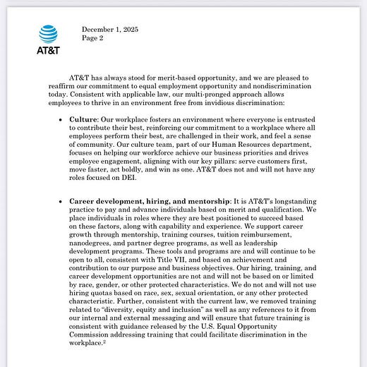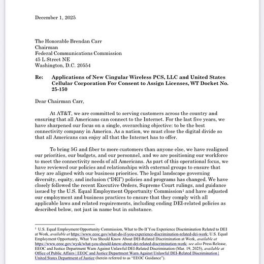 Two days before AT&T and UScellular announced the billion-dollar deal, America elected Donald Trump as president of the United States. On Dec. 2, 2025, 11 months after Trump issued an executive order banning "Federal contractors who have provided DEI training," FCC chair Brendan Carr tweeted a letter from AT&T promising that it was out of the diversity business.