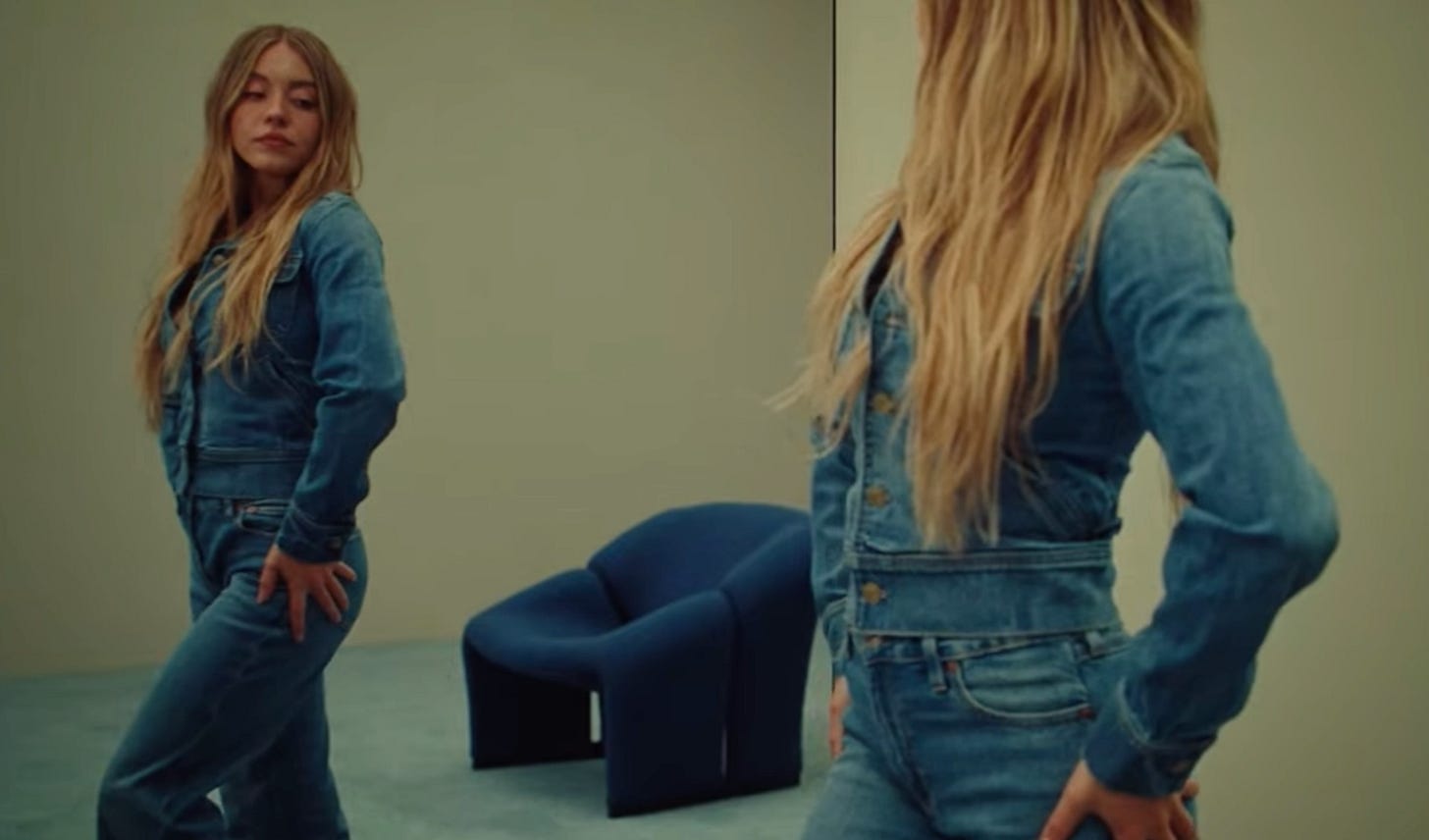 In a second version of the American Eagle ad, the camera follows as she walks, lingering on her classic Caucasian derriere as brief and thin as the Gettysburg Address. She is a vision of Aryan beauty, a white American dream.