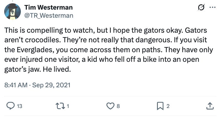 So, when I watched a Florida bruh (which is different than a Florida Man) coax an eight-foot alligator into a garbage can using nothing but ingenuity and the unfailing grip of Adidas slides, I was shocked when people sided with the alligator.