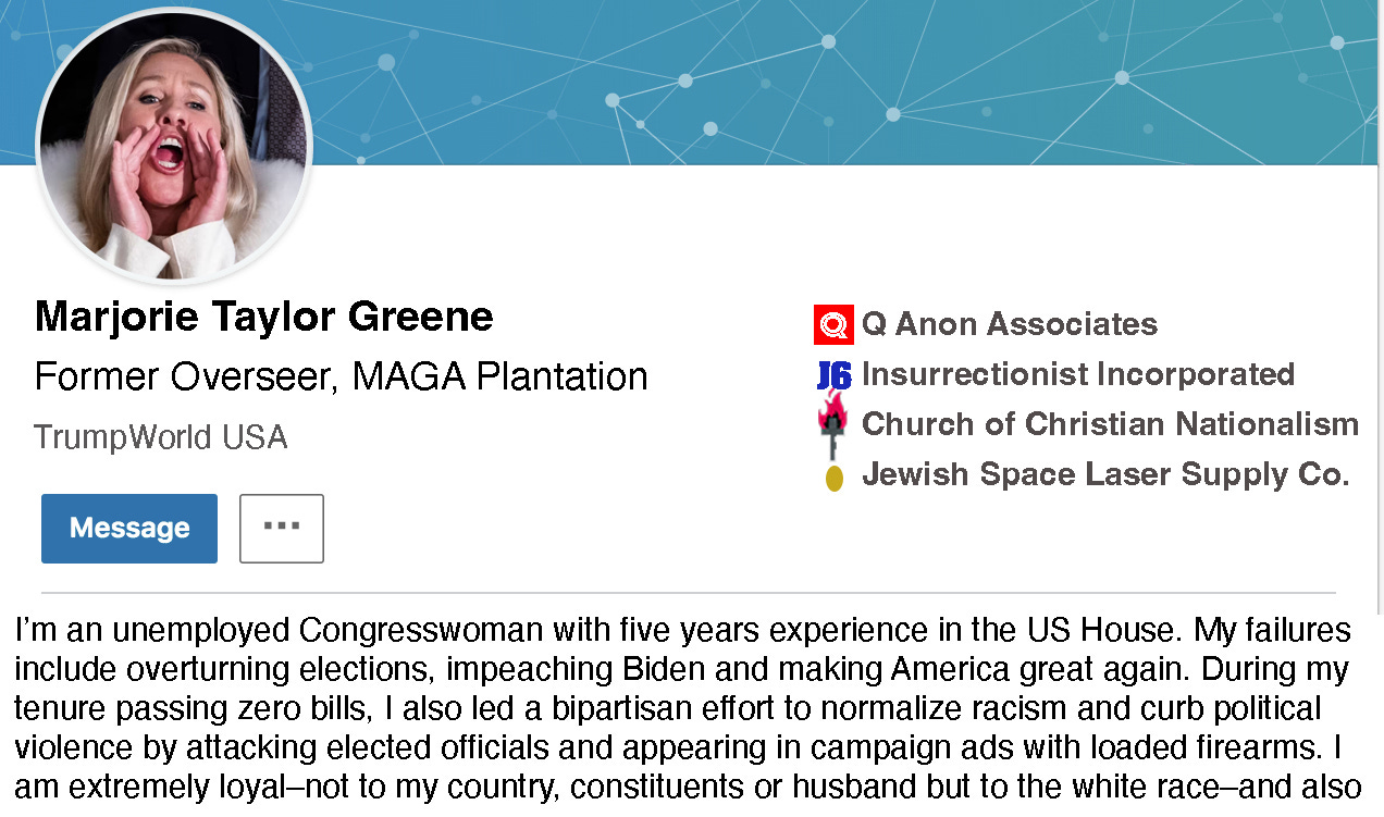 While Greene’s emigration from MAGAland shocked Washington insiders, others are wondering about her future plans. Aside from Vanity Fair, Fox News and every major corporation in the world, who would hire a mediocre white woman with no apparent experience or expertise?